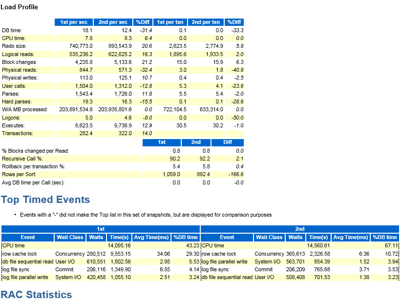 Analysis: 8.9% improvements in CPU time caused 31.4% improvement DB time. The focus here is to show how CPU scaling governor affects Oracle service and wait times; not to show how to tune Oracle events such as "row cache lock" above.